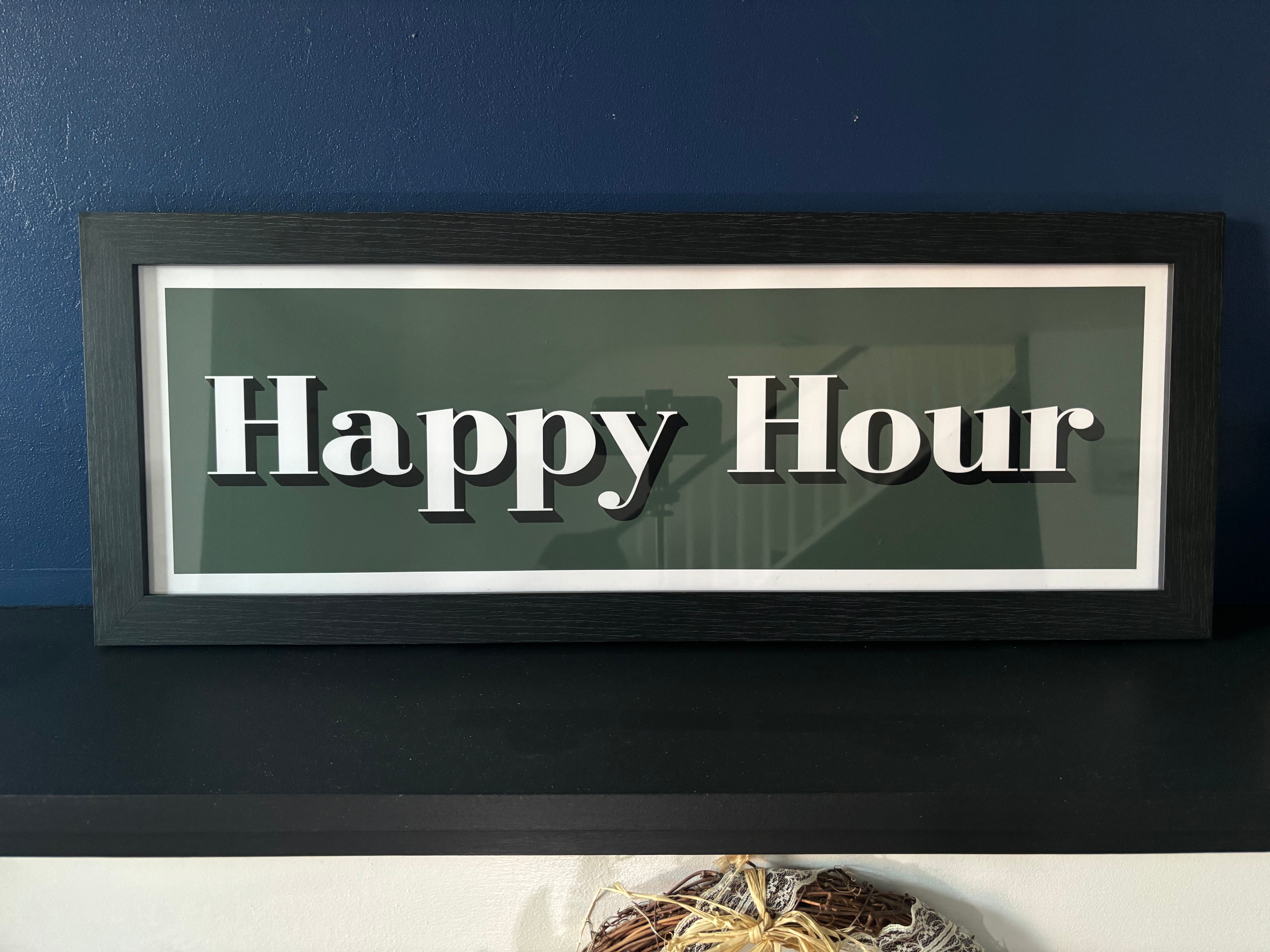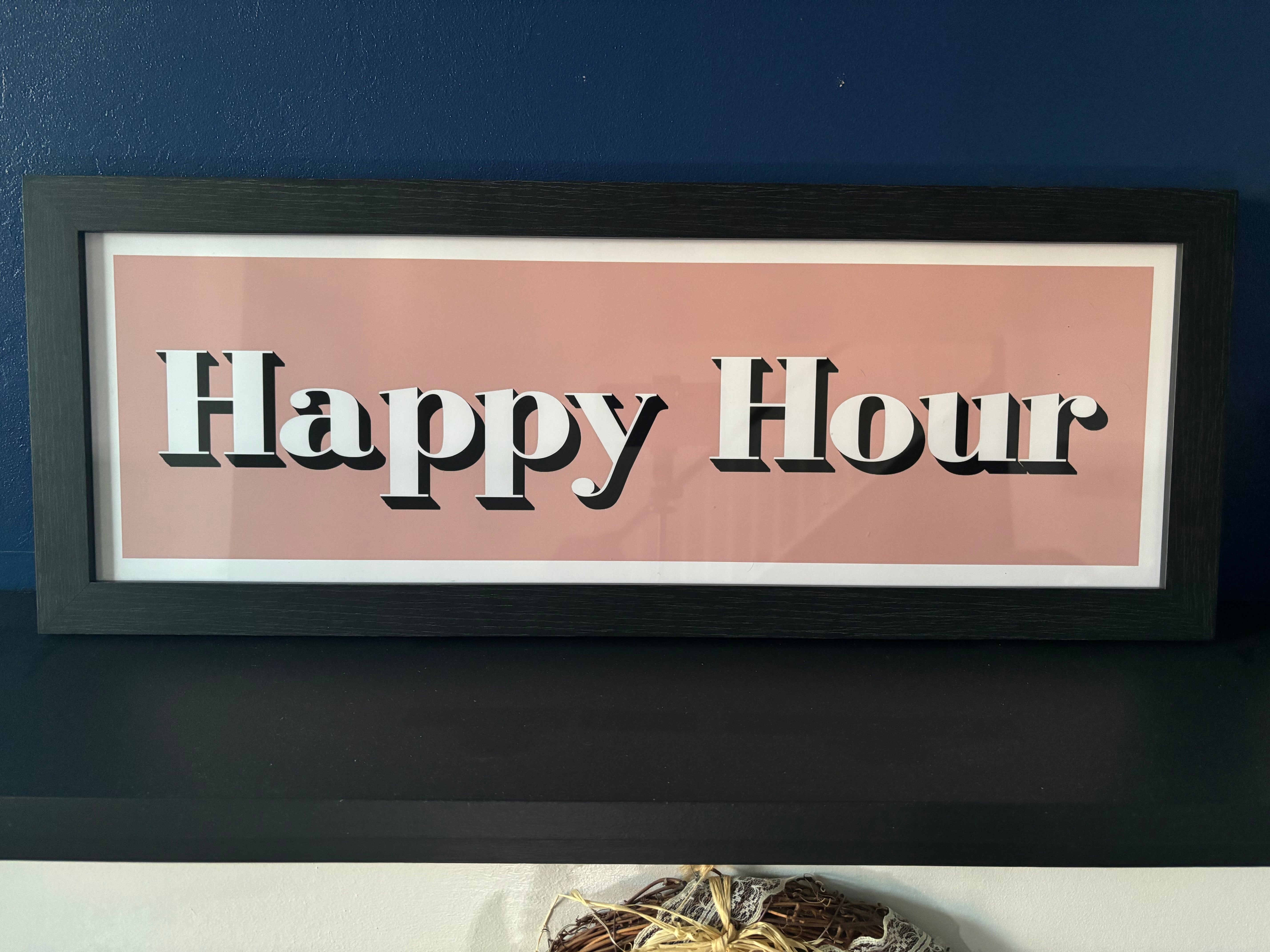 Add a touch of charm to your home with our framed Happy Hour print. Perfect for displaying above a door, over a fireplace, or anywhere you want to make a subtle yet stylish statement.